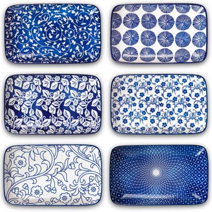 Ceramic 8 inch Rectangular Salad Plates, Dinner Plates, Pasta Dessert Plates for Appetizer, Sushi, Fruit – Microwave/oven/Dishwasher Safe, Set of 6, Vintage Blue
