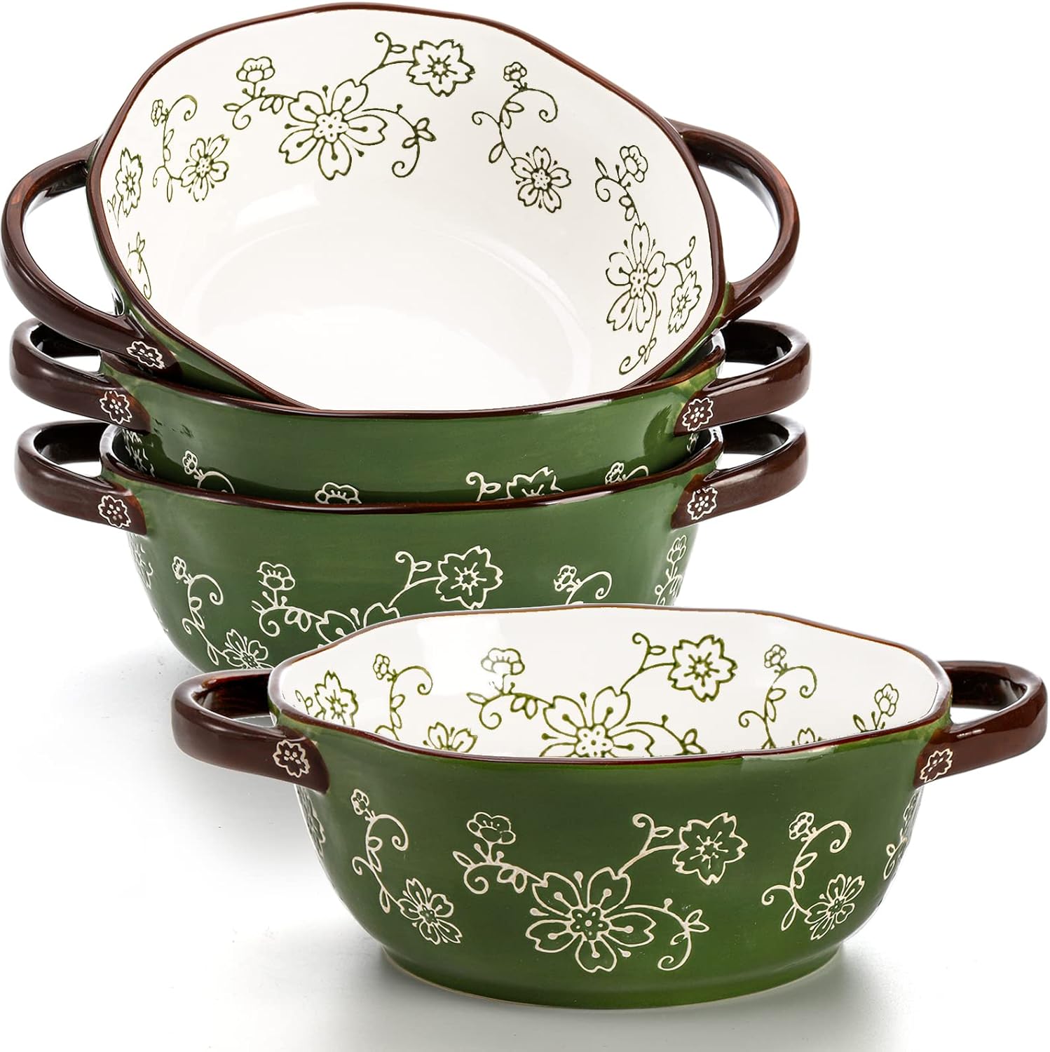 4 Pack Ceramic Soup Bowls, 22 Ounces Porcelain Serving Bowl Set with Double Handle, Large Ceramic Crocks for French Onion Soup, Stew, Pasta, Cereal, Pot Pies (Green)