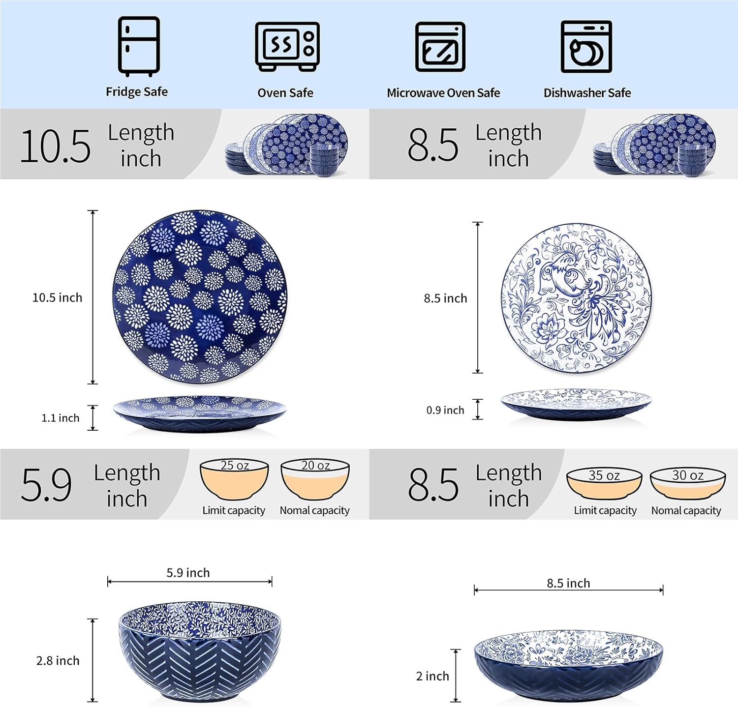 • CLASSIC BLUE COLOR & EXQUISITE DESIGN – ‘s plates and bowls are designed with four different blue-white patterns, each with its own unique charm. The beautiful embossed exterior paired with a variety of interior patterns exudes classic, vintage, and timeless aesthetics. A wonderful addition to your table and kitchen. It will make your meal enjoyable.